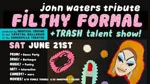 You’re invited to a dance party / variety show / excuse to wear your most vile, stupid, and repulsive formal fashions — Saturday night, June 21st, in the Crystal Ballroom at Somerville Theatre. You’ll inhabit a Pink Flamingo’d lawnscape, kneel at a shrine to Divine, pose for photos under a low-rent prom arch, and pencil in your own Maybeline mustaches, whilst sipping signature cocktails.